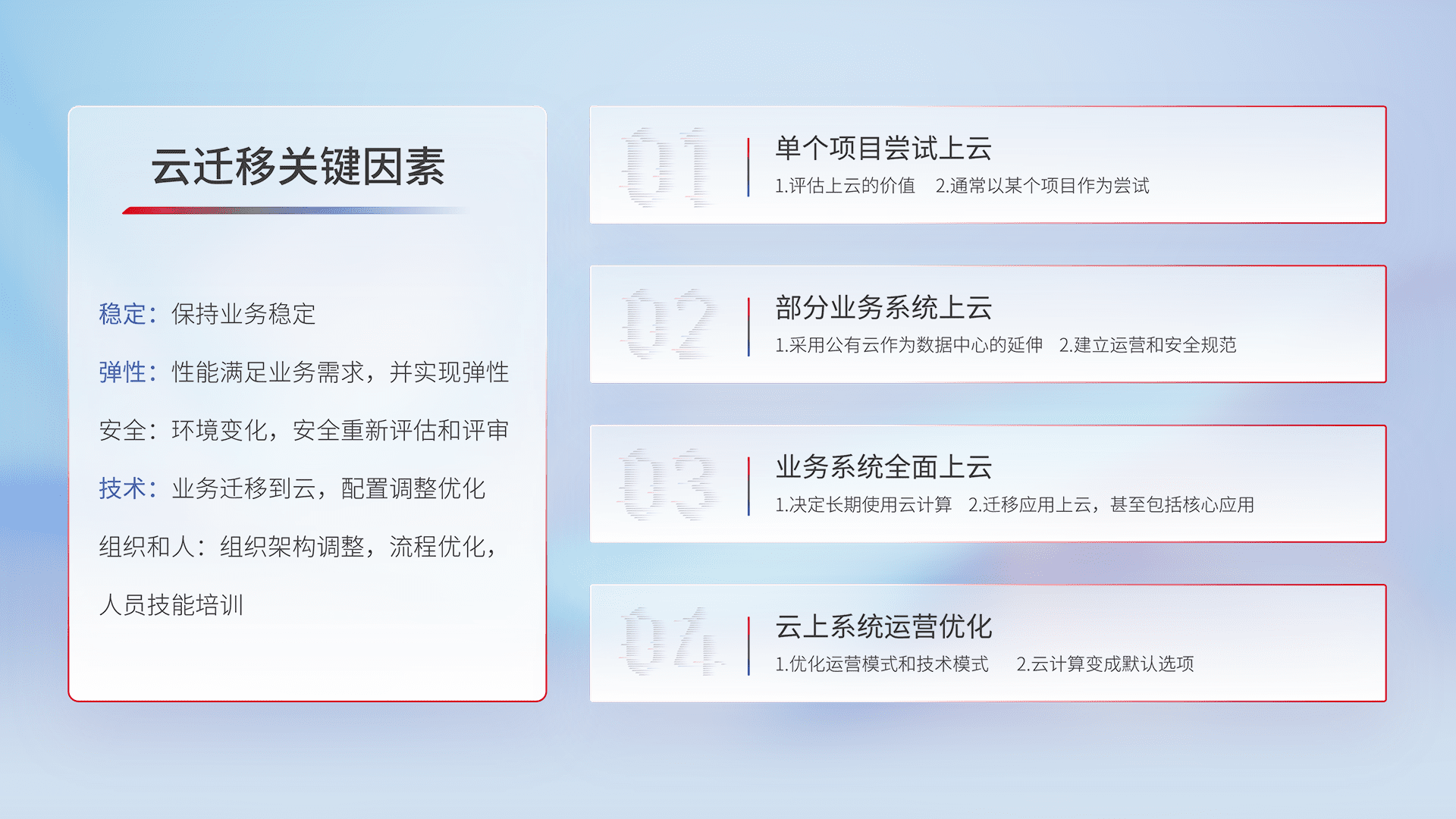 结合实际业务,,,,从规划设计、、、、云平台选型、、云原生改造、、数据迁移、、、集成交付,,迁移全过程为客户识别最佳上云路径,,,做好风险识别管理,,,设计网络架构、、、身份权限、、安全审计合规、、、、操作审计、、、、日志审计、、监控告警策略、、、、多站点容灾设计等,,对云上基础设施进行整体规划,,,,提升IT治理水平,,以满足弹性、、高可用、、、、高性能的需求。。。。