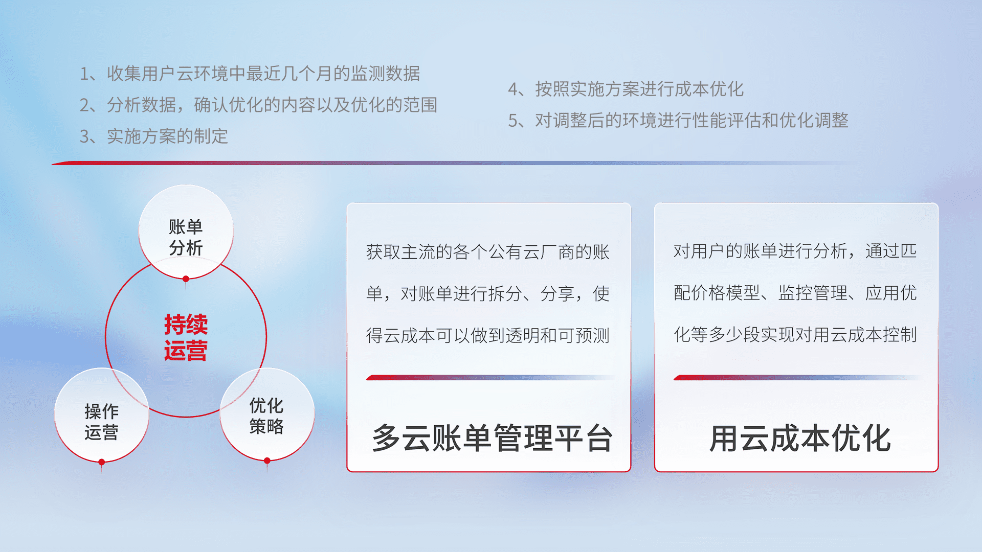 通过多云纳管,,以统一的资源数据模型把客户的云资源进行抽象和封装,,进而实现对多云资源的统一操作,,,保障云资源管理的可靠性、、、稳定性与可用性。。量身定制化运维内容,,配置、、开发运维、、、补丁管理、、、、备份、、、、监控、、、、认证和访问管理、、、审计和日常巡检等,,,保障在用云过程中的可靠度,,稳定度以及高可用率。。